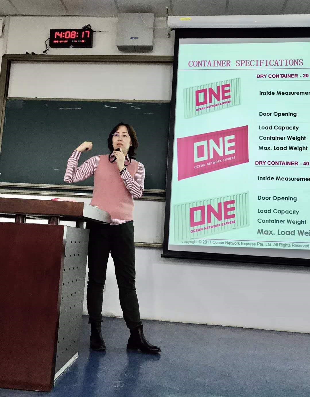 姜李心总经理 首先介绍了航运业风起云涌的30年,世界排名前20名的各大船公司的现状;然后介绍了ONE公司的企业组织结构、金沙app、项目流程、运营情况、公司愿景、遇到的挑战与机会;最后对学生入职及职场发展给予指导。